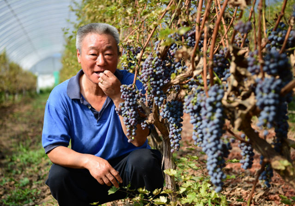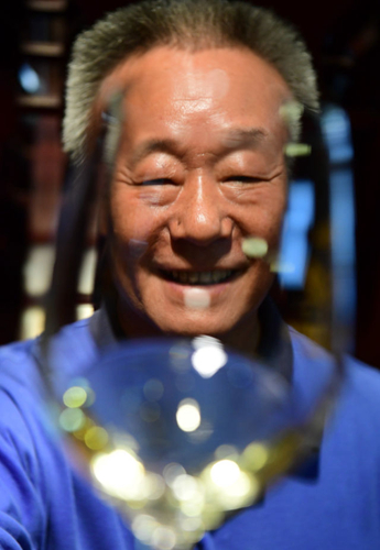 李华与他酿制的干白葡萄酒(9月7日摄)。
