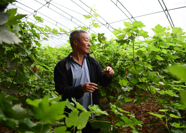 8月29日,李华在位于陕西杨凌的实验基地大棚内对葡萄进行疏叶。