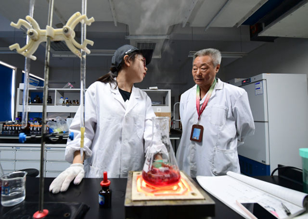 9月7日,李华(右)在西北农林科技大学葡萄酒学院实验室内对正在做实验的学生祝悦进行指导。